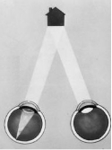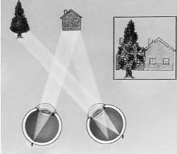 (一只眼向内斜视导致双眼无法落在同一目标上,为减轻视觉干扰,大脑会自发抑制斜视眼睛看到的树木之影像,久之则导致该眼弱视)