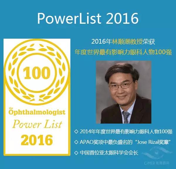 林顺潮教授在眼科多个分支学科(青光眼、玻璃体视网膜、角膜疾病、白内障和屈光手术)及基础眼病研究等方向均取得性的影响,连续2年被眼科媒体评为世界眼科界100位影响力人物之一(此奖项每两年评选一次)。