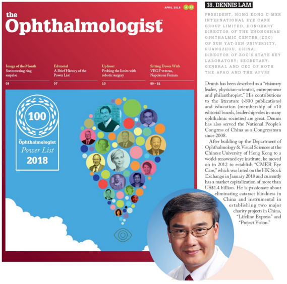 《眼科医生》每两年推出一次世界眼科人物影响力100强榜单。入选的100位眼科人物来自多个国家和地区,他们当中有眼科医生、科学家、工程师、眼科医疗机构的CEO等。今年是林顺潮教授连续第三次入选该榜单,排名18。