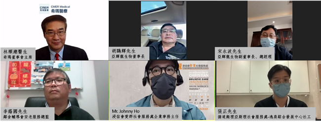 林顺潮医生(希玛董事会主席) 、胡鹍辉先生(亚辉龙生物科技股份有限公司董事长) 、宋永波先生(亚辉龙生物科技股份有限公司副董事长、总经理) 、李荫国先生(邻舍辅导会安老服务总监)、Mr. Johnny Ho (浸信会爱群社会服务处企业事务主任) 、张正先生(循道卫理亚斯理社会服务处-逸葵综合发展中心社工)